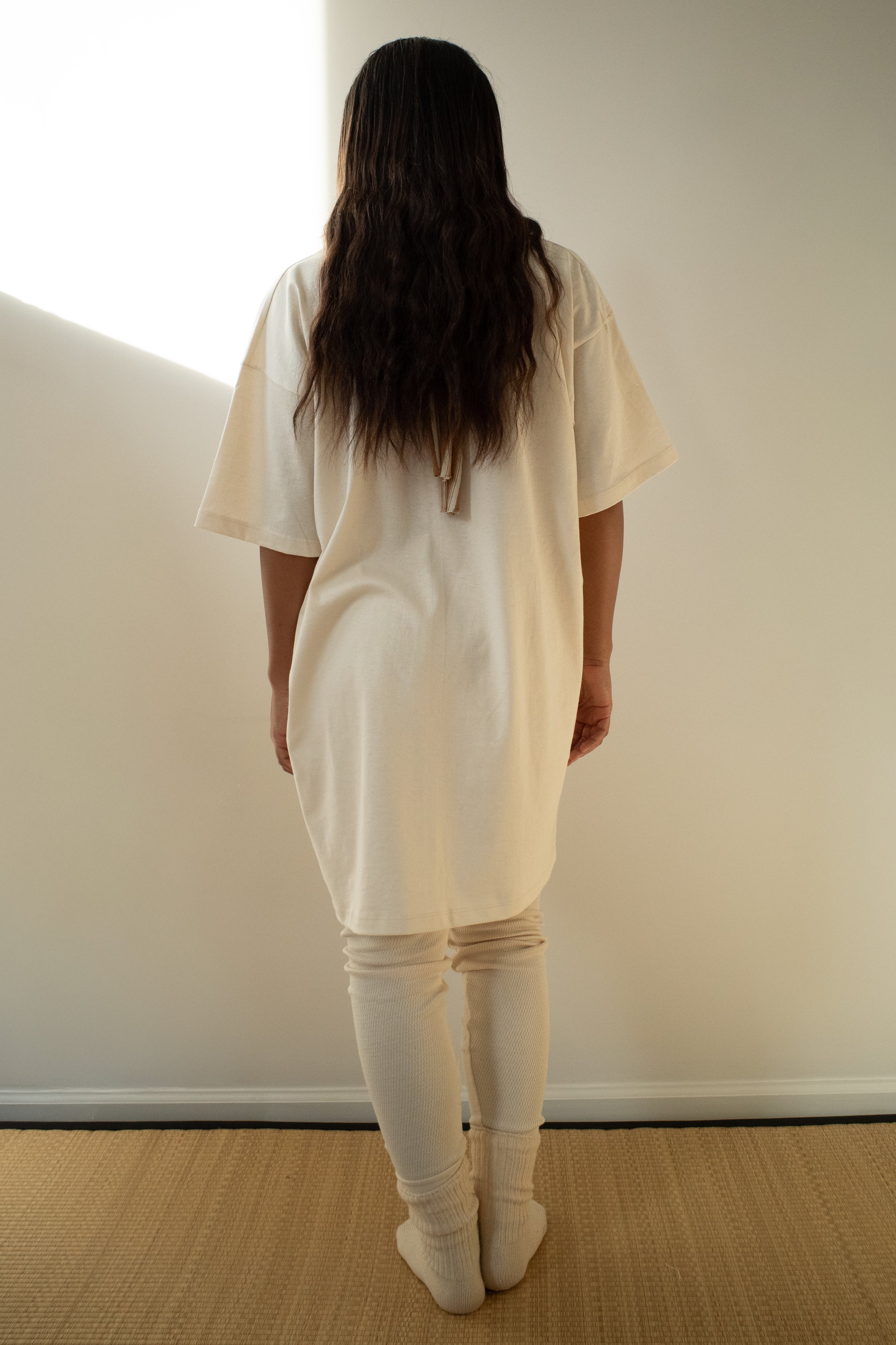 Made in the USA unbleached and undyed organic cotton night shirt. Basically just a super long scoop neck T-Shirt, this night shirt is made with 100% certified organic cotton grown in Texas. Grown, spun, knit cut and sewn all in the USA.