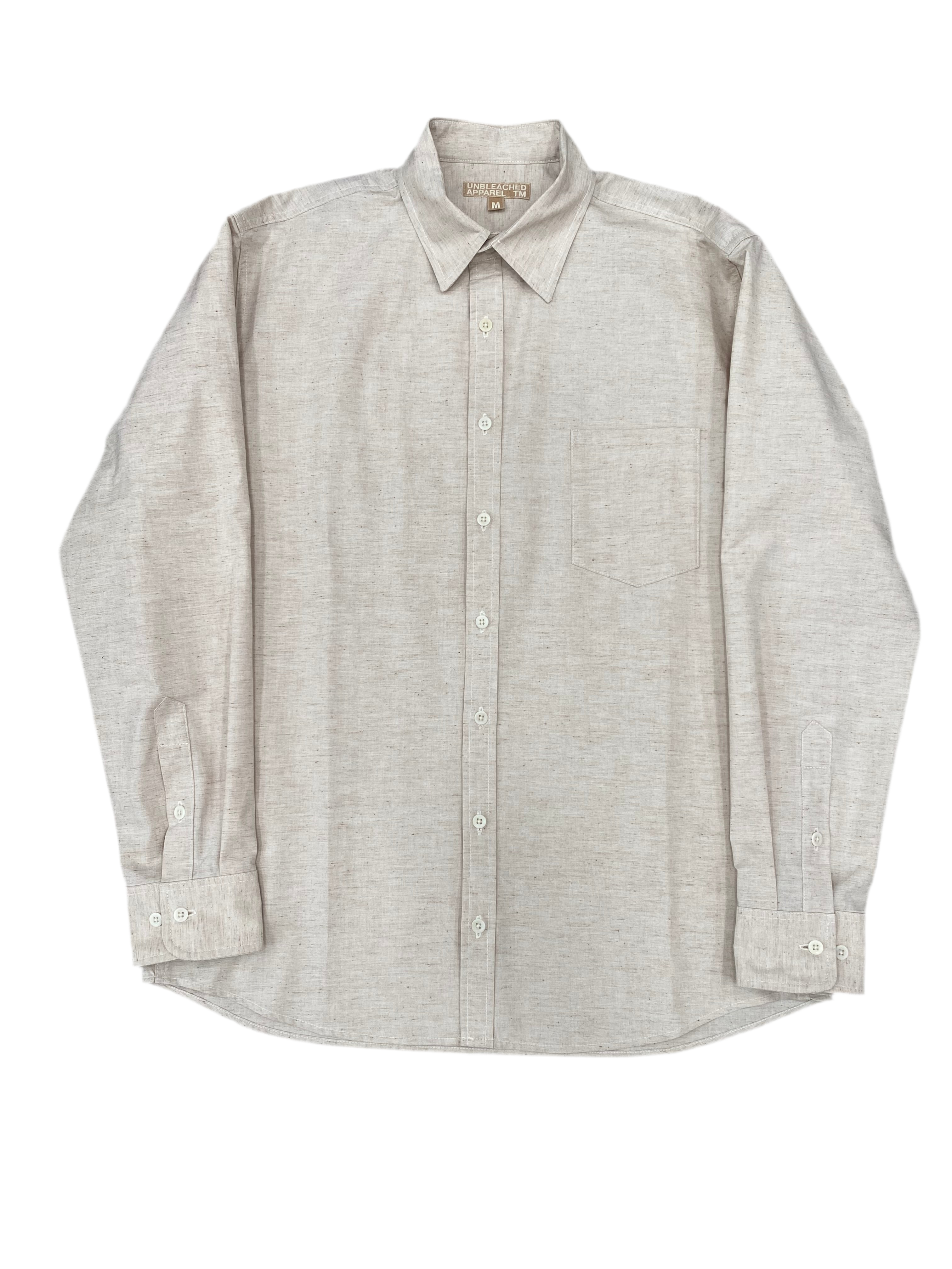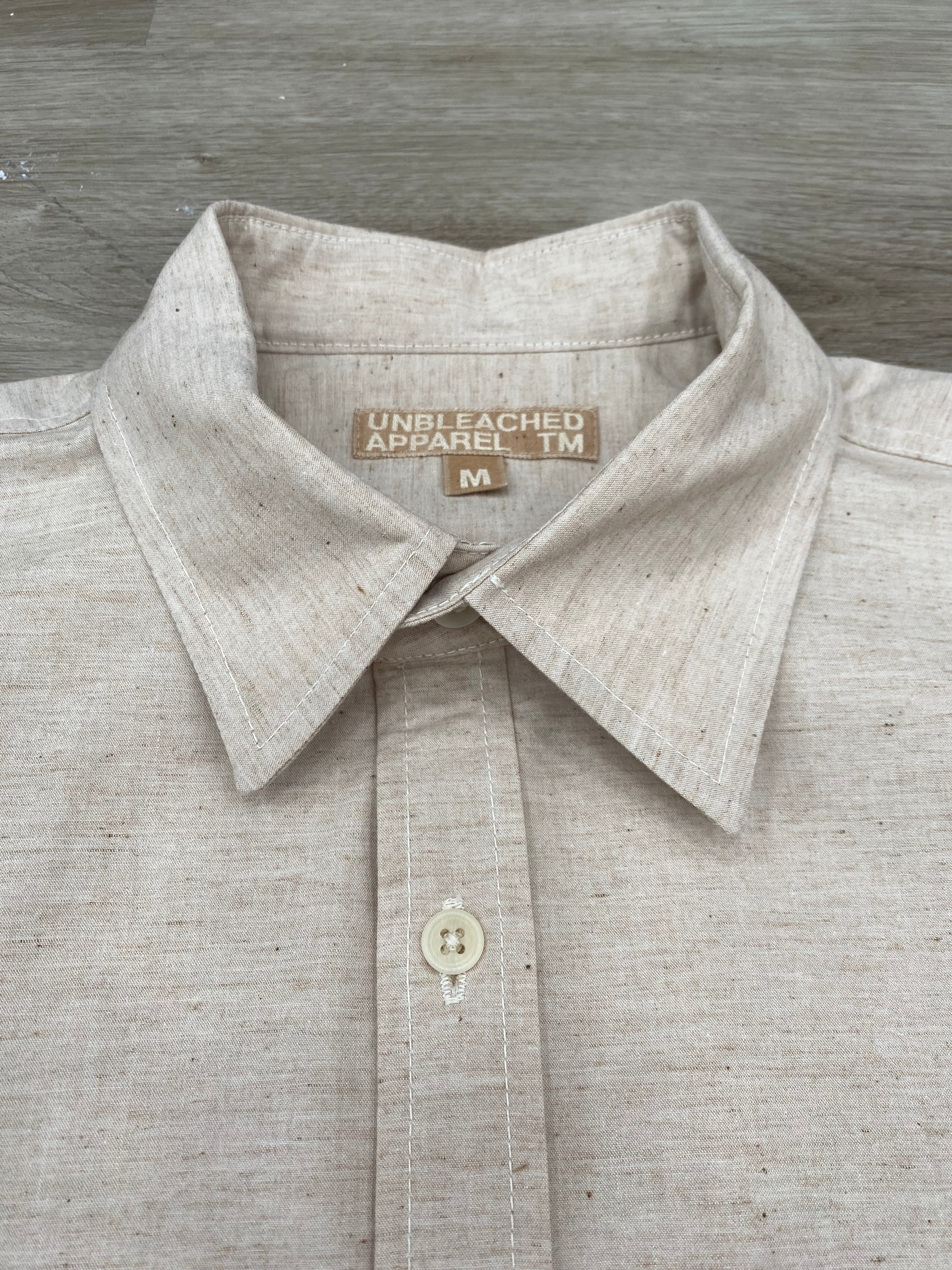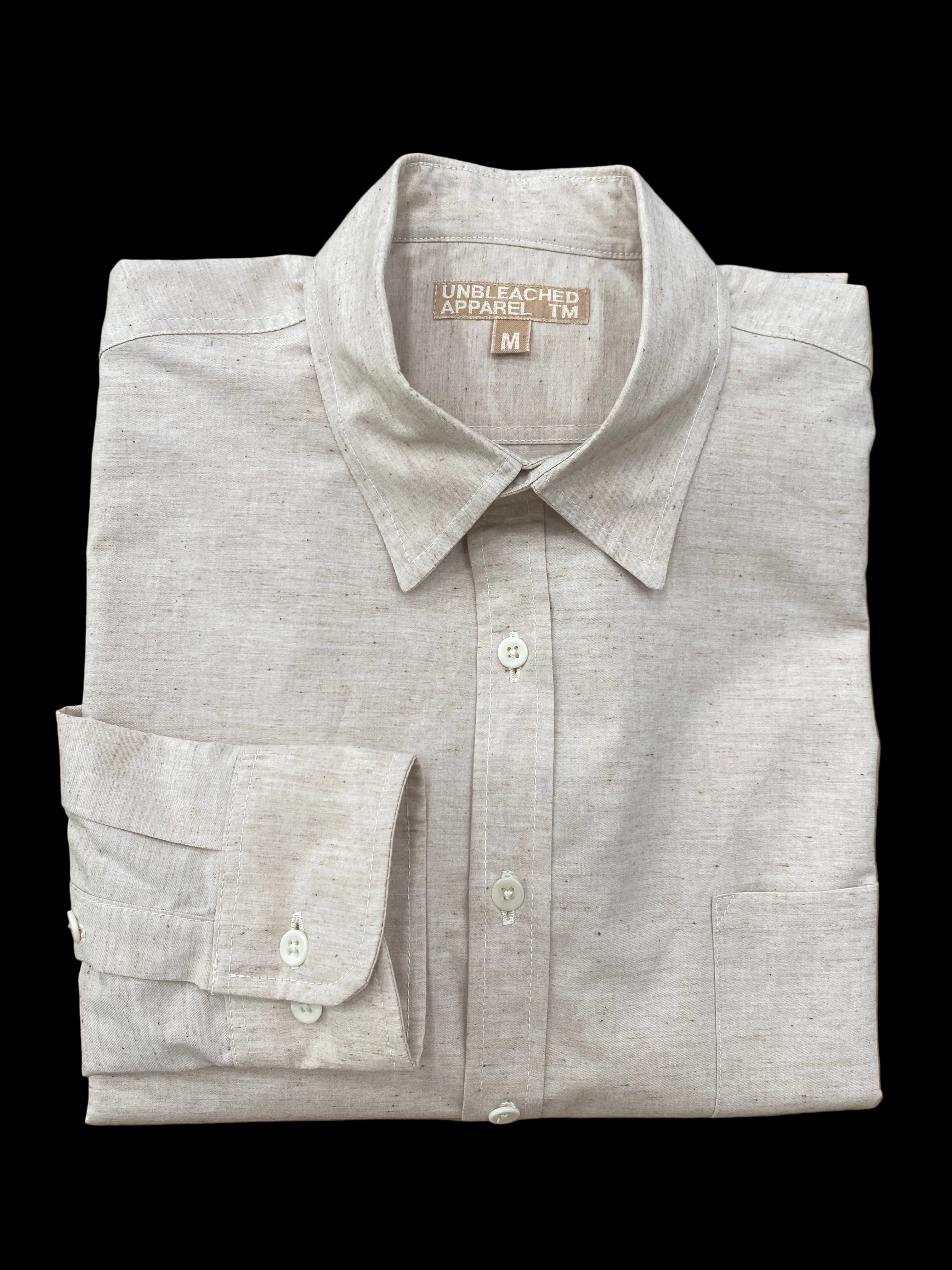 Note: We went well out of our way to design this shirt to be completely plastic-free and sewn with 100% dye-free organic cotton sewing thread. Most dress shirts will have a synthetic interfacing fabric (inside the collar, cuffs, etc.) to give it structure. We made sure to use a natural 100% cotton interfacing and all-natural trims to achieve an actually, truly plastic-free garment. Since natural cotton sewing thread is not as strong as polyester, we also reengineered the stitching techniques to give reinforcement on all stress points. However, please exercise appropriate caution when wearing and washing the shirt to account for the slightly more delicate natural sewing technique.